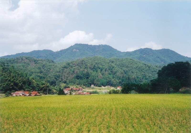 万徳院跡越しに日山城跡(右端上)を望む。